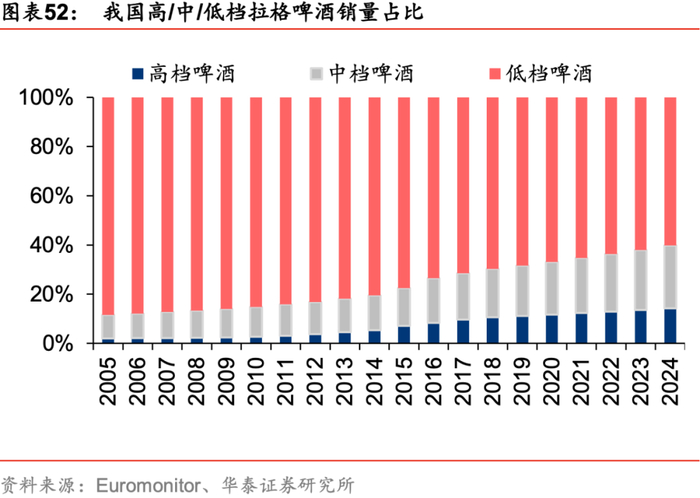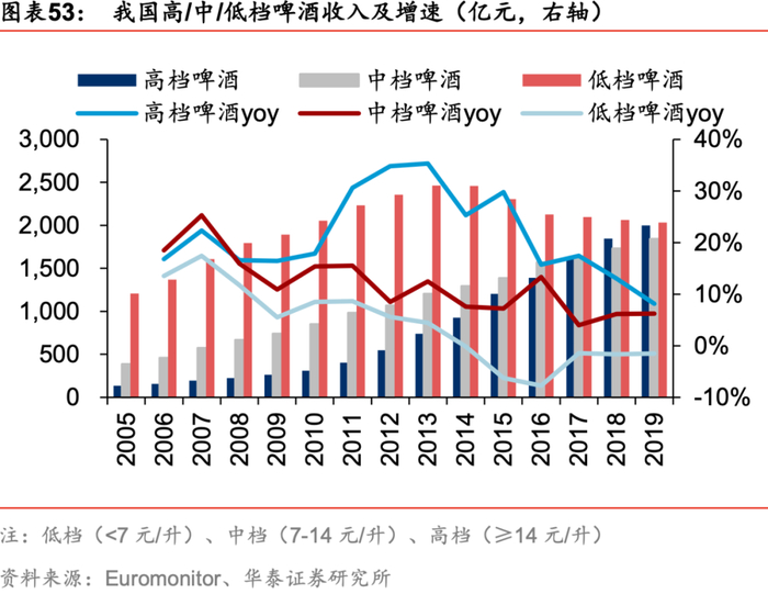 需求端:消费升级成强劲拉力,啤酒行业高端化加速演化。需求端看,2001-2019年中/美/日三国人均GDP复合增速为12%/3%/1%,我国收入的高速增长为行业高端化提供强大需求支撑。销售端,08年起高档啤酒代替中档啤酒成为增长主力并持续领涨,销量占比由08年的2%提升至19年的11%,Euromonitor预测,考虑疫情影响,20-24年高/中/低档啤酒销量CAGR分别+4%/+3%/-6%,至2024年,销量占比达14%/21%/67%,高端化进程持续推进。
