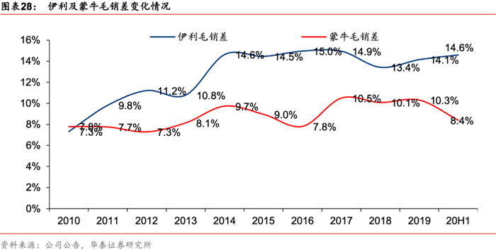 竞争趋缓下行业龙头伊利的毛销差显著提升,伊利略领先于蒙牛。毛销差(毛利率-销售费用率)体现了在权衡行业竞争及产品结构升级后公司的真实盈利水平,过去十年中伊利毛销差波动向上,伊利自2010年的7.3%提升至2019年的14.1%,蒙牛则自2010年的7.8%提升至2019年的10.3%,19年伊利的毛销差略高于蒙牛。历史中伊利两次毛销差显著提升主要系原奶价格上升:2011年公司毛利率受成本影响下降,但销售费用率变化幅度高于毛利率(11年毛利率/销售费用率yoy-0.99/-3.48pct),从而带领毛销差提升;13年公司提价后14毛利率同比大幅提升3.8pct,但销售费用率提升幅度(同比+0.62pct)小于毛利率,故14年后毛销差再次上行。站在当前时点,在原奶价格上涨压力的背景下,乳企有望缩减费用投放,行业竞争有望趋缓,带动毛销差提升。