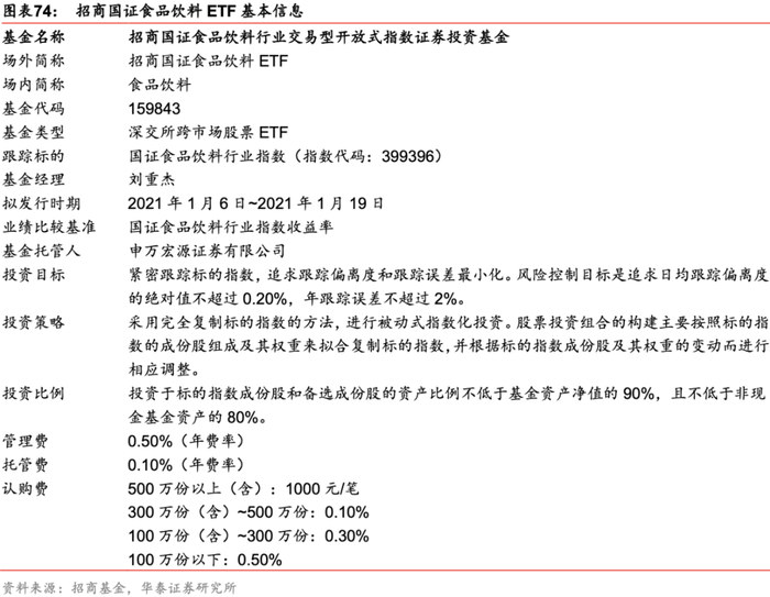 招商国证食品饮料行业交易型开放式指数证券投资基金(基金代码:159843),场外简称招商国证食品饮料ETF,场内简称食品饮料,标的指数为国证食品饮料行业指数(指数代码:399396)。该基金的投资目标为紧密跟踪标的指数,追求跟踪偏离度和跟踪误差的最小化。基金主要投资于标的指数成份股、备选成份股,投资于标的指数成份股和备选成份股的资产比例不低于基金资产净值的90%,且不低于非现金基金资产的80%。招商国证食品饮料ETF募集期自2021年1月6日至1月19日。