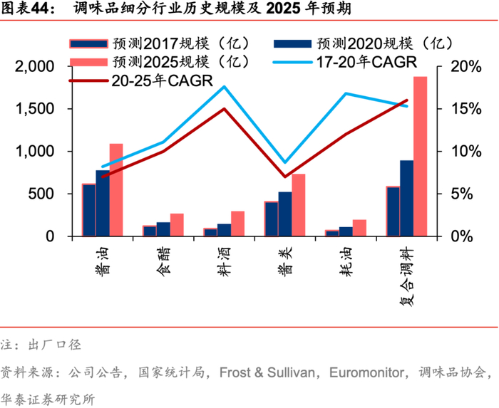 (一)传统品类:1)酱油行业市场规模预计维持稳健增长,根据Frost& Sullivan预测,酱油行业市场规模2020-2025年复合增速有望达7%,疫情加速行业洗牌,出清以小B客户为主的中小酱油企业,我们预期未来延续高端化趋势, 2)食醋行业规模小于酱油,高端化、功能化和消费场景多元化打开增长空间,龙头企业在产品品类创新和区域拓展上更具优势,据Frost& Sullivan预测,酱油行业市场规模2020-2025年复合增速有望达10%。3)酱类行业延续复合化趋势,我们预计未来有望维持稳健增长,根据Frost& Sullivan预测,酱类产品市场规模2020-2025年复合增速有望达7%。