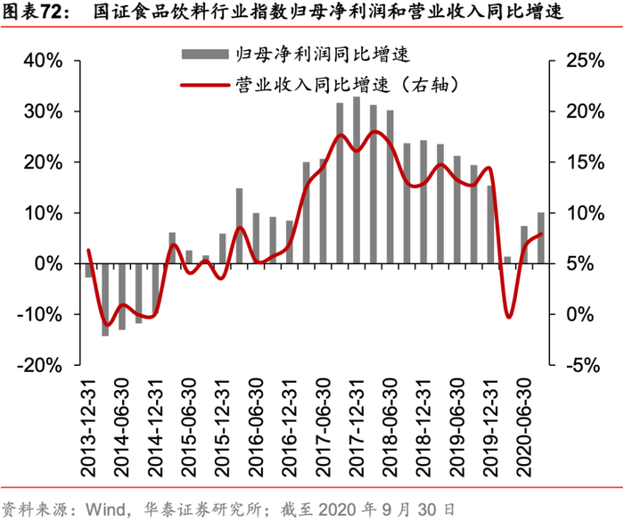 调味品:此轮疫情加速了行业集中度的提升以及消费习惯的改变、餐饮连锁化加速,龙头市占率提升:调味品20H1营收出现波动,20Q3恢复常态,龙头在此轮疫情中展现出更强抗风险能力,疫情加速了线上消费和社区团购的普及,线上消费习惯逐渐培育以及餐饮连锁化的进程。展望未来,从需求恢复层面来看,餐饮渠道作为调味品消费的主要渠道正处于恢复过程中,我们认为,21年(假定疫情不反弹)餐饮端有望逐步恢复至正常状态,预计将对调味品餐饮渠道消费贡献增量。从价格维度来看,2020年原材料价格上行,大豆、包装物成本上涨压力较大,调味品或将逐步进入提价窗口,而产品升级、结构高端化是均价上行另一主要驱动因素。从更长期的维度看,对于调味品行业,我们持续看好:1)传统品类:酱油、食醋等相对成熟的大品类子行业在消费升级、渠道下沉与精耕方面更具备潜力,看好稳健增长的可持续性,且龙头市占率将稳步提升。2)新兴品类:具备较大渗透率提升空间的复合调味料品类成长性较好,高端化和复合化将继续推动调味品行业增长。