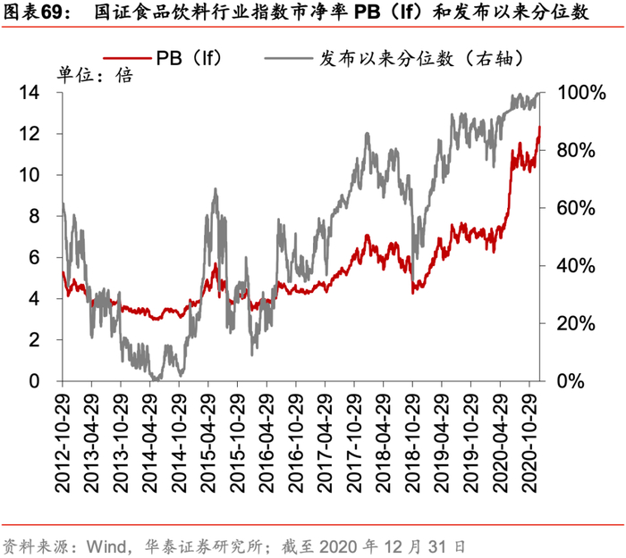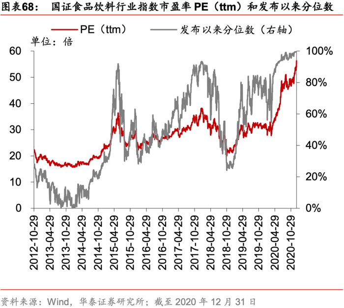 纵向考察国证食品饮料行业指数历史估值水平。截至2020年12月31日,该指数市盈率PE(ttm)为56.3倍,处于指数发布日(2012年10月29日)以来的100.0%分位数水平。该指数市净率PB(lf)为12.3倍,处于100.0%分位数水平。