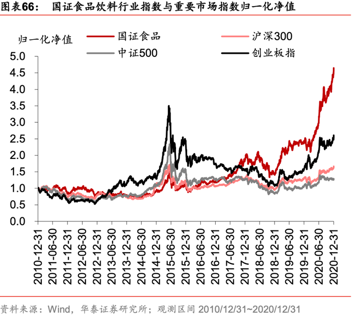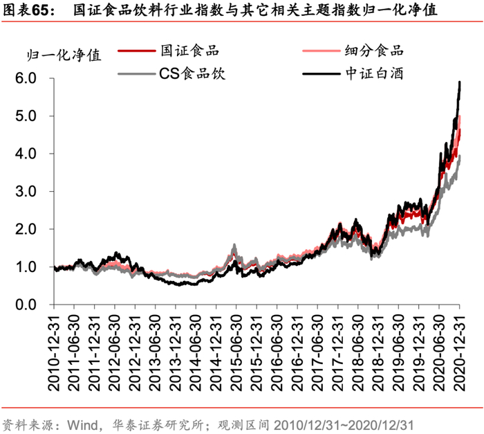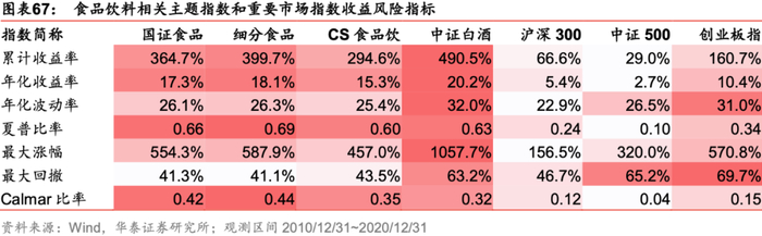 统计区间内(2010年12月31日至2020年12月31日)国证食品饮料行业指数表现和其它相关主题指数表现接近,整体优于沪深300、中证500、创业板指等主要宽基指数。计算指数收益风险指标,国证食品饮料行业指数的年化收益率、年化波动率和最大回撤均低于中证白酒,与细分食品和CS食品饮接近;夏普比率和其它相关主题指数接近,优于主要宽基指数。食品饮料行业这一优质赛道在过去十年具备显著的Alpha特征,我们认为拥有长期配置价值。