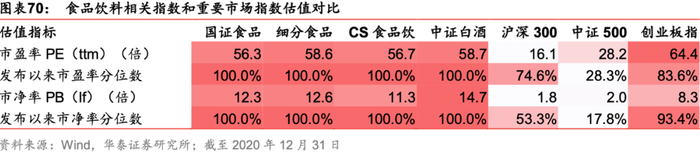 横向考察2020年12月31日食品饮料相关主题指数和重要市场指数的估值指标以及各指数发布以来分位数,如下表所示。国证食品饮料行业指数市盈率低于创业板指,略低于细分食品、CS食品饮和中证白酒,高于沪深300和中证500指数。国证食品饮料行业指数市净率低于细分食品和中证白酒,高于其余可比指数。