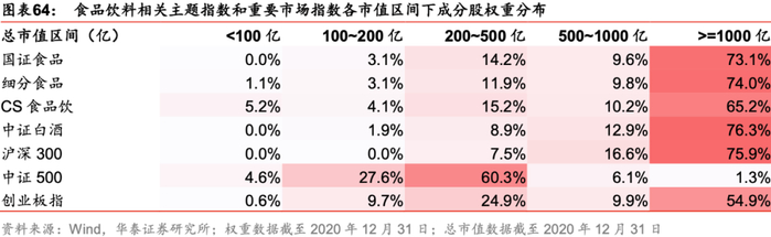 下面从成分股的权重分布分析指数市值特征,将个股总市值划分为小于100亿、100~200亿、200~500亿、500~1000亿以及大于1000亿这五个区间,各市值区间下成分股权重分布如下表所示。国证食品饮料行业指数具有鲜明的大市值风格,市值大于1000亿股票权重占比73.1%,市值大于200亿股票权重累计占比达96.9%。其余食品饮料相关主题指数同样具有大市值风格。