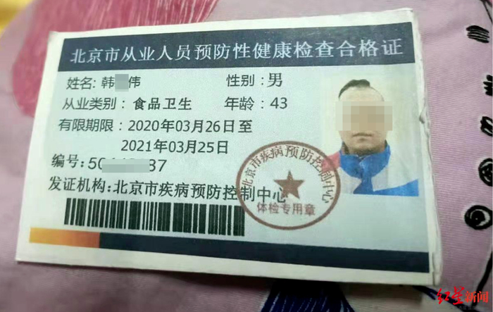 在韩某伟的健康证上,记者看到,该证的核发机构为北京市疾病预防控制中心,有效期限为2020年3月26日至2021年3月25日,从业类别则为食品卫生。另据王某回忆,当时办理健康证时,韩某伟做过胸透、内科查体、便检、采血等多个项目,均无任何问题。