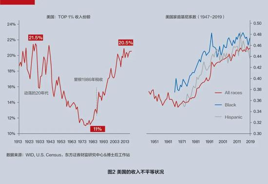 导致不平等和阶级分化的时间则要追溯到20世纪70年代初。美国收入最高的1%人群所占份额从1975年的10%提高到了如今的22%,收入前10%与后90%的人群各占50%。由于财富是收入的积累,财富的集中度要远高于收入。截至2019年底,美国最富有的1%人群的财富份额约为40%,比20世纪70年代的低位提高了约10%(Stone等,2020)。美国当下的贫富分化程度与一个世纪前“咆哮的二十年代”相当。冷冰冰的数据背后,是社会向上流动性的下降,向下流动性的提高;是教育机会的不均等;是人均寿命整体下滑和阶层差异;是劳动相对于资本式微……任何国家,不平等都是有限度的,研究收入分配的知名学者布兰科·米兰诺维奇 (B. Milanovic)表示,还没有哪个富裕的现代民主国家的收入不平等程度像今天的美国这么高。从历史经验来看,一个先进的民主国家的基尼系数超过0.45是非常危险的(见图2)。