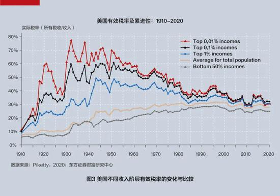 建设更强大、更公平的经济,实现包容式增长。联合工作组将经济、民主和美国的灵魂联系在一起,主张对外重建公平的竞争环境,对内强调发展的包容性,承诺与美国人民缔结一份新的社会和经济契约。从具体内容看,这是一份为中产阶级量身定制的契约:它承认所有美国人都有权享受高质量、负担得起的医疗保健;认为住房是一项权利而不是一项特权,并承诺在这个世界上最富裕的国家,没有人会无家可归或挨饿;将提高工资,恢复工人组织、加入工会和集体谈判的权利;确保妇女享受同工同酬的权力;所有人享有带薪家庭休假;确保种族平等;为所有人提供可靠和负担得起的银行和金融服务;指示监管机构考虑医疗保健等企业兼并对劳动力市场、低收入人群和种族平等的潜在影响。报告还提出,将改革税法,使之更加进步和公平,其指导原则是,最富有的美国人应承担更多的税收负担,让投资者支付与工人相同的税率[2],终结代价高昂且毫无成效的税收漏洞。近半个世纪的贫富分化,是伴随着税收的累进属性的退化而产生的(见图3)。