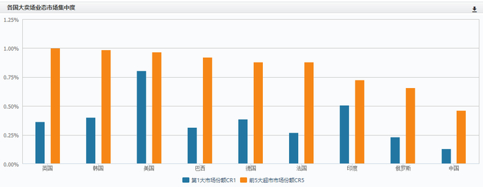 在部分发达国家中,CR1的市场份额远远大于中国的CR1。因此中国的超市巨头还有很大的发展空间。其次,CR5的份额也低于其他国家。因此中国的超市业的竞争尚未进入白热化阶段。