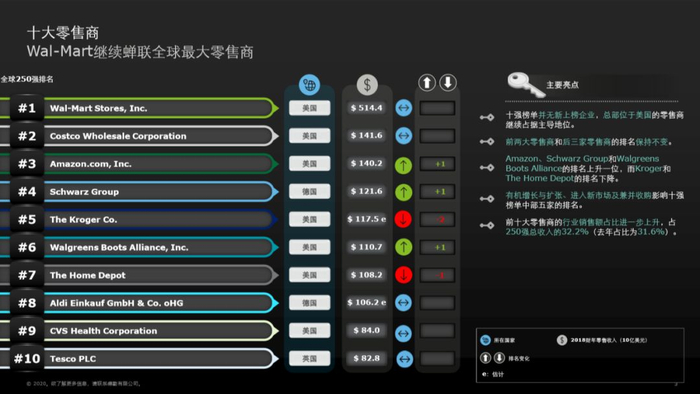 德勤 (Deloitte) 根据2018财年(截至2019年6月30日的财政年度)全球各大零售商公开的数据,最新发布《2020全球零售力量》(Global Powers of Retailing 2020)。报告显示全球零售250强2018财年共计创收4.74万亿美元,复合增长率达4.1%。其中中国14家零售企业上榜。