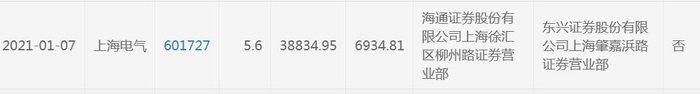 上海电气昨日还有一笔大宗交易,成交价格5.6元,成交6934万股,成交金额3.88亿元,买入方为海通证券上海徐汇区柳州路证券营业部,卖出方为东兴证券上海肇嘉浜路证券营业部,以中午最新收盘价计算,该笔大宗交易买入方浮盈3325万元。