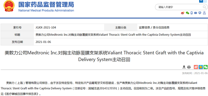 本次召回的产品为胸主动脉覆膜支架系统Valiant Thoracic Stent Graft with the Captivia Delivery System,注册证或备案凭证编码为国械注进20143135591,生产企业为Medtronic Inc.美敦力公司,代理人名称为美敦力(上海)管理有限公司,该产品用于胸降主动脉疾病的治疗,包括但不局限于胸降动脉瘤和胸降主动脉夹层。Valiant胸主动脉覆膜支架适用于动脉瘤、假腔或破裂位点的隔离,以及恢复流经主动脉覆膜支架腔的血流。该器械主要用于常规手术修补候选患者和因已有风险因素不能进行常规手术修补的候选患者。召回原因系美敦力巴西公司共发现三个批号产品的葡萄牙文标签有误,主要为产品名称和注册证号的错误。该问题不会影响产品性能,未收到投诉,未发现本问题引起的患者伤害,从患者安全角度是没有危害的。