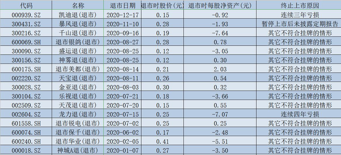 从退市时间看,2020年7月至8月为退市的密集期。其中,7月退市4家,8月退市6家,两月退市占全年比例62.5%。另外,16家退市企业时的股价均不足1元,退市平均股价0.22元;退市时平均每股净资产-1.94元,千山药机退市时每股净资产甚至为-7.64元。