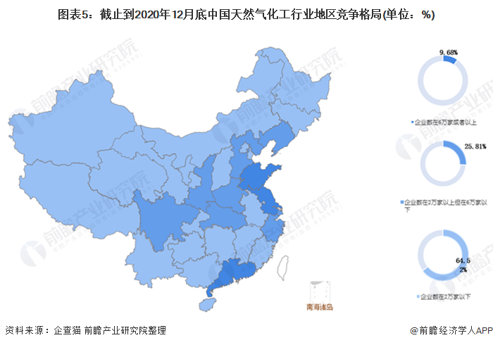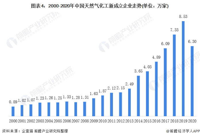 从新成立企业数来看,2000-2020年中国天然气化工新成立企业呈现逐年上升趋势。自2013年起,中国天然气化工新成立企业出现爆发式增长;在2019年达到了峰值8.53万家。2020年,中国天然气化工新成立企业有6.3万家。