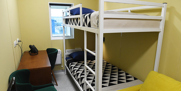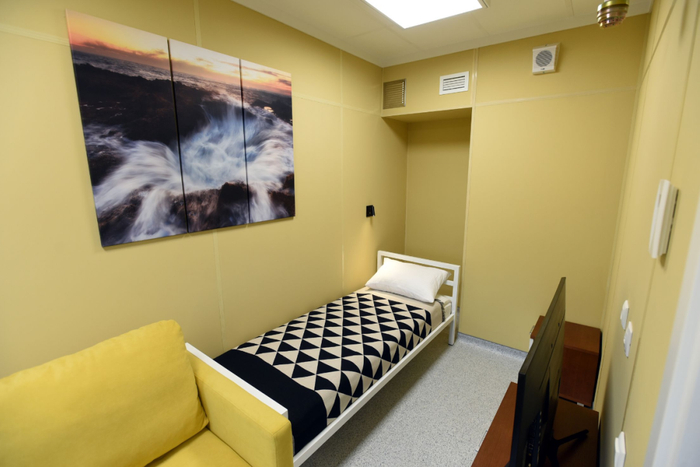 “东方-2”站建筑内部的科考队员双人/单人卧室,采用暖色调的装修风格,测试组装时拍摄。