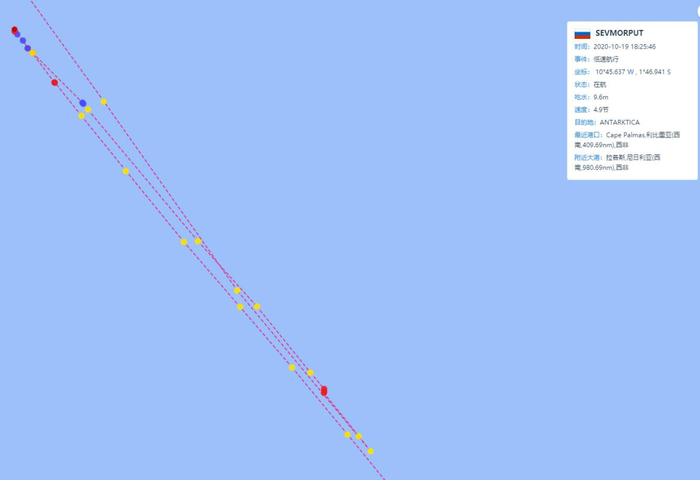 2020年10月5日21时,俄罗斯“北方海路”(Севморпуть)号核动力破冰货船从圣彼得堡启航,以18节的平均航速一路南下,并于当月17日18时半,在西经12°的大西洋东部的西非海域,从北向南穿过了赤道。这也意味着“北方海路”号有望成为全球第一艘抵达南极海域的核动力破冰船。