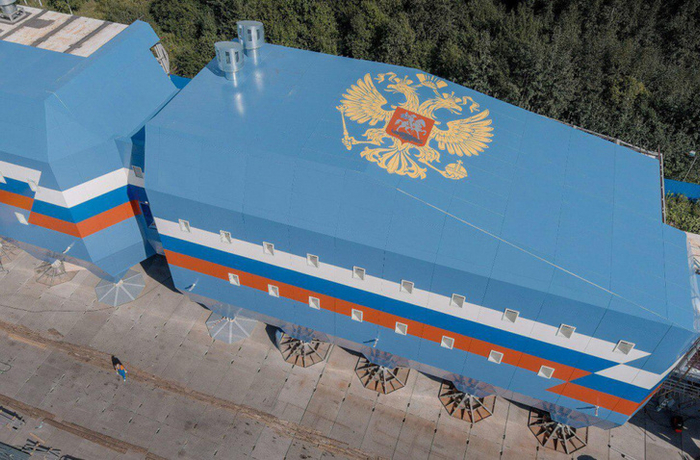 测试组装完成后的“东方-2”站建筑群,墙壁的国旗涂装和屋顶巨大的国徽,都彰显着俄罗斯的极地大国雄心。