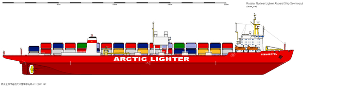 这艘船类似于雪龙号,是破冰集装箱船。细分起来,它是属于lighter aboard(载驳船)——将集装箱分别装在74艘小驳船上(每船的载重量为300吨),这些小驳船又装在母船上。卸货无需靠码头,用自带的大型龙门吊车把载货的小驳船吊进水面,用顶推轮运走。俄罗斯的北冰洋沿岸的几个大河口,只有一些几千人的小镇,物资需求不大,大部分货物是运往内陆。只能在河口卸下驳船,再经河流驶向南方的西伯利亚内陆地区。