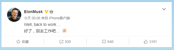 在新浪微博上,8日凌晨,马斯克也发了一条动态: