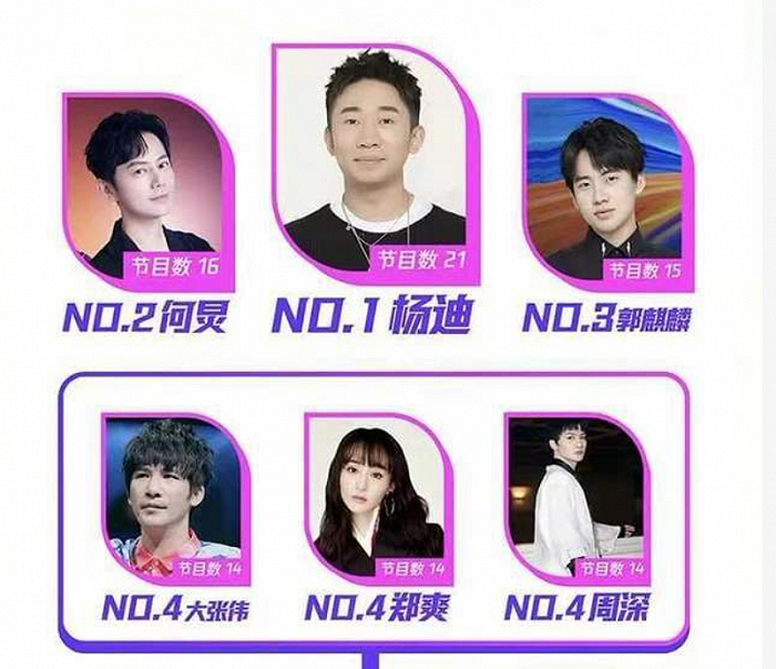 日前有数据平台统计2020年出演综艺最多的艺人榜单,杨迪以21档节目成为2020年最忙综艺咖,何炅则以16档名列第二,少班主郭麒麟以一己之力养活全家,出演了15档综艺。大张伟、郑爽及周深则均以14档节目并列第四。