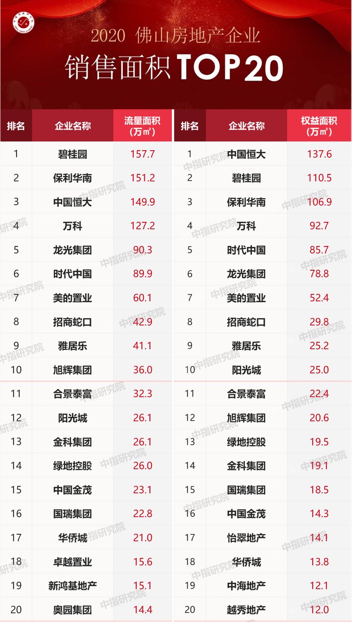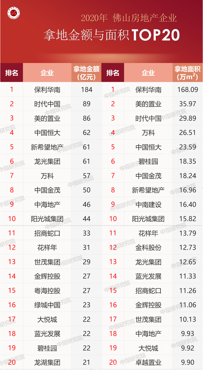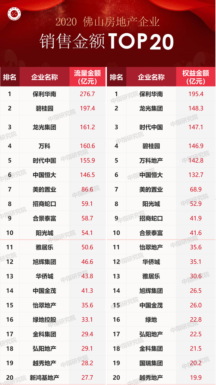 2020年佛山房地产企业销售拿地排行榜