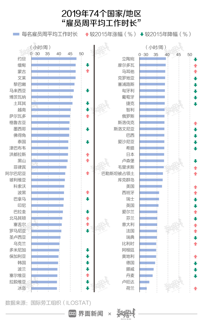 值得一提的是,与2015年相比,韩国、英国等至少33个国家/地区“上班族”2019年周平均工作时长有所下降。
