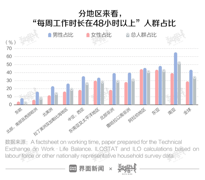 那么,全球范围内,“过劳”真的有所缓解吗?据国际劳工组织发表于2018年一份研究论文《Working Time and The Future of Work》,全球约有36.1%的劳动力每周工作超48小时。其中,南亚男性占比最多,达到60%以上,远超其他地区。