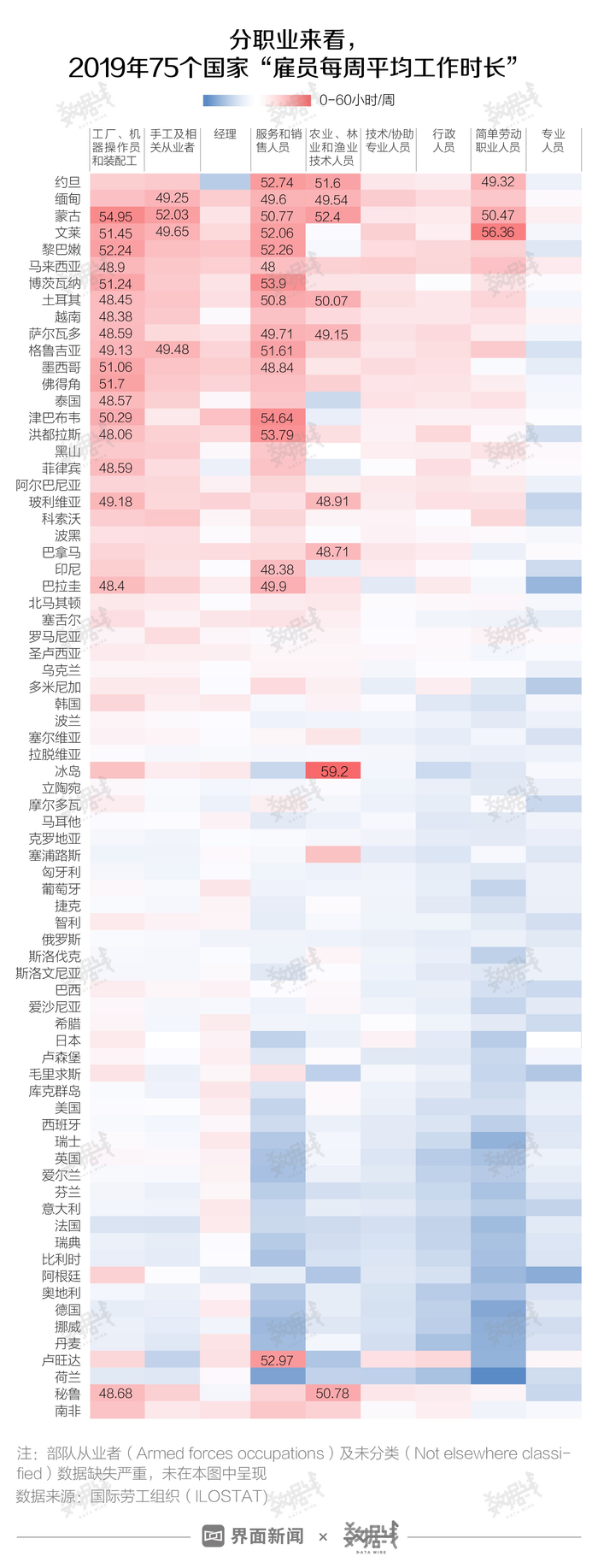 在国际劳工组织划分的职业类型中,工厂、机器操作员和装配工(Plant and Machine Operators, and Assemblers)、服务和销售人员(Service and Sales Workers)等职业“过劳”严重,部分国家/地区相关从业者每周平均工作时长达到50小时以上。