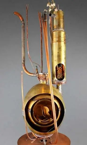 该仪器已经被切开,以显示内部结构,工作原理类似于阿特沃特使用的炸弹热量计。球形内壳装有水样,能量由电流增加,科学家观察状态的变化。进入20世纪60年代,他们的实验数据指导了蒸汽动力设备的设计和评估。