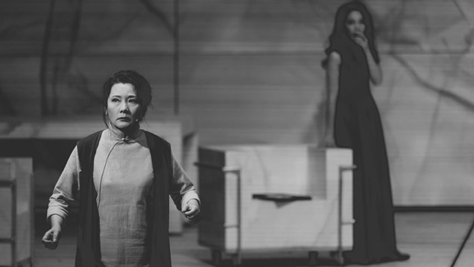 《雷雨·后》剧照。晚年周朴园、鲁侍萍达成“谅解”,剧中人物“闪回”。