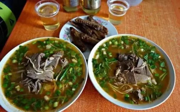 香泉吃羊肉面,常常是一锅吃,面、羊肉都汇集在这一锅里,配上八宝茶来吃。羊肉面最上面是绿油油的一层切成片的大蒜叶,再下面就是面和羊肉,层层饱满,像在家里吃火锅的感觉。