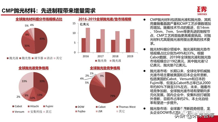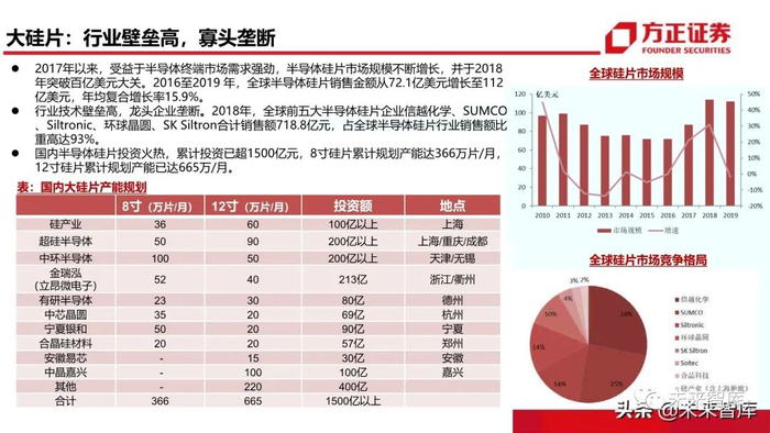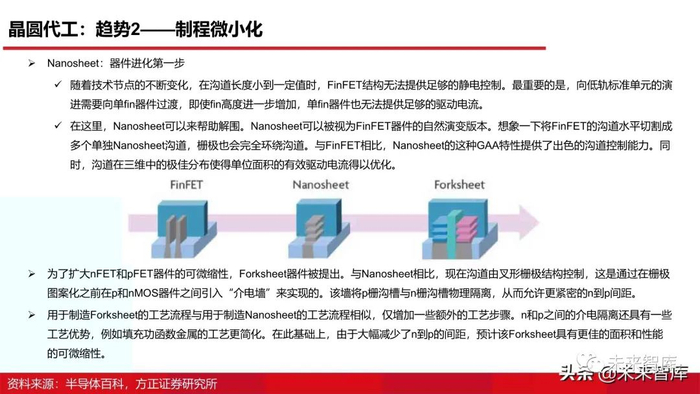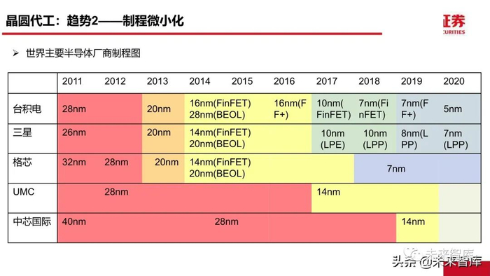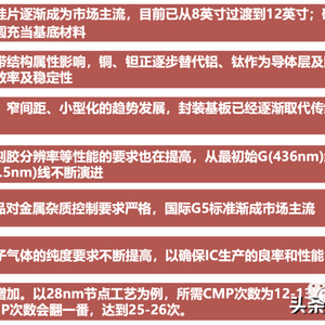 从技术要求来看,制造环节技术难度最大,是半导体产业追随摩尔定律发展的主要瓶颈之一,也是技术突破 发展的主要方向,其微观尺度已走到5-7nm的水平,是当今人类最精密制造能力的体现。