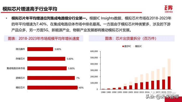 模拟芯片年平均增速位列集成电路细分行业第一。根据IC Insights数据,模拟芯片市场在2018-2023年 的年平均增速为7.40%,在集成电路总体市场中排名最高。一方面由于模拟芯片种类繁多,涉及的下游 产品众多,另一方面5G、新能源产业、物联产业发展都将推动模拟芯片发展。