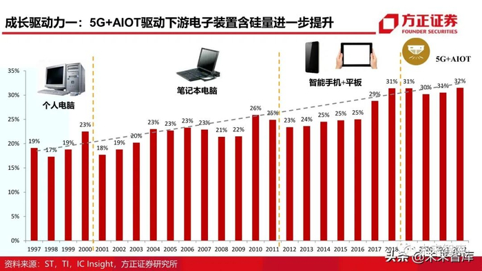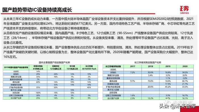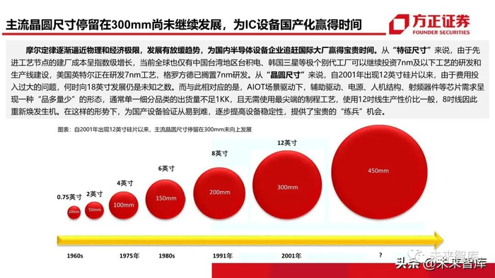 摩尔定律逐渐逼近物理和经济极限,发展有放缓趋势,为国内半导体设备企业追赶国际大厂赢得宝贵时间。从“特征尺寸”来说,由于先 进工艺节点的建厂成本呈指数级增长,当前全球也仅有中国台湾地区台积电、韩国三星等极个别代工厂可以继续投资7nm及以下工艺的研发和 生产线建设,美国英特尔正在研发7nm工艺,格罗方德已搁置7nm研发。从“晶圆尺寸”来说,自2001年出现12英寸硅片以来,由于费用投 入过大的问题,何时向18英寸发展仍是未知之数。而与此相对应的是,AIOT场景驱动下,辅助驱动、电源、人机结构、射频器件等芯片需求呈 现一种“品多量少”的形态,通常单一细分品类的出货量不足1KK,且无需使用最尖端的制程工艺,使用12吋线生产性价比一般,8吋线因此 重新焕发生机。在这样的形势下,为国产设备验证从易到难,逐步提高设备稳定性,提供了宝贵的“练兵”机会。