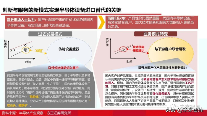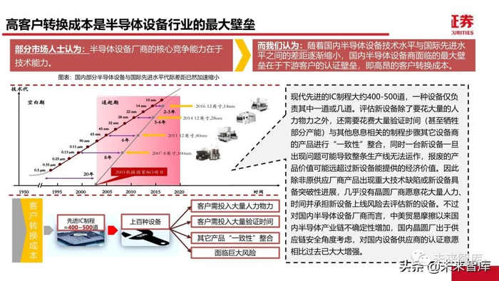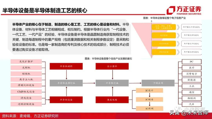半导体产业的核心在于制造,制造的核心是工艺,工艺的核心是设备和材料。半导 体设备、材料与半导体工艺相辅相成,相互制约。根据半导体行业内“一代设备, 一代工艺,一代产品”的经验,半导体设备是半导体是晶圆制造商获取制程技术的 关键,制造每道制程中的量产规格(包括量测数据和相关制程参数设定)是采购和 验收设备的标准。也是每一家制造商的专利及核心技术的组成部分,制程技术必须 要通过购买设备才能取得。