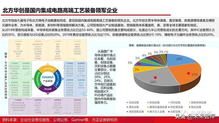 以刻蚀(25%)、沉积(24%)、清洗(5%)、热处理(4%)等主要环节设备价值占比来看,合计设备价值占比达58%,即大陆市场对应116亿美元采购需求。刻蚀、沉积设 备按照30%国产化率,清洗、热处理设备按照50%国产化率,刻蚀、沉积设备对应约30亿美元国产设备订单,清洗、热处理设备对应9亿美元国产设备订单。以北方华创未来在 四大设备产品领域50%国产占比上限测算,北方华创IC设备国产订单空间对应约140亿元人民币,成长空间广阔。