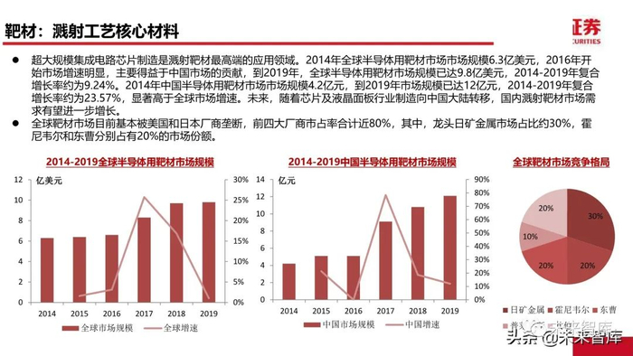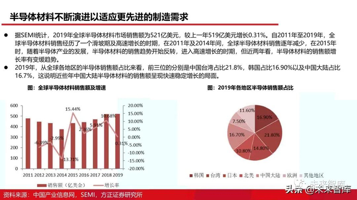 据SEMI统计,2019年全球半导体材料市场销售额为521亿美元,较上一年519亿美元增长0.31%。自2011年至2019年,全 球半导体材料销售经历了一个滑坡期及高速增长的时期,在2011年及2014年间,全球半导体材料销售逐年减少,在2015年 时,随着半导体产业的发展,半导体材料的销售趋势开始反转,进入高速增长的时期,但近两年看,半导体材料的销售额增 长率有变缓趋势。