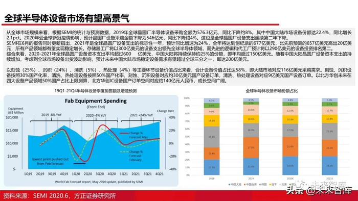 从全球市场规模来看,根据SEMI的统计与预测数据,2019年全球晶圆厂半导体设备采购金额为576.3亿元,同比下降约8%。其中中国大陆市场设备份额达22.4%,同比增长 2.1pct。2020年受全球新冠疫情影响,预计晶圆厂设备采购金额下降为546亿元,同比下降约4%。这也是全球晶圆厂设备支出连续第二年下降。SEMI在6月的报告同时更新指出,2021年是全球晶圆厂设备支出的标志性一年,预计同比增速为24%,全年将达到创纪录的677亿美元,比先前预测的657亿美元高出20亿美 元,所有产品领域都有望实现稳定增长。存储器工厂将以300亿美元的设备支出领先全球半导体领域,而先进的逻辑和代工厂预计将以290亿美元的设备投资排名第二。综合来看,2020-2021年全球晶圆厂设备资本支出平均超过600 亿美元,中国大陆将持续保持约25%的份额,即年均超过150亿美元。随着中国大陆晶圆厂设备资本支出的持 续增加,考虑到全球市场设备出货波动影响,预计未来中国大陆市场稳定设备需求有望超过全球三分之一,即达200亿美元。