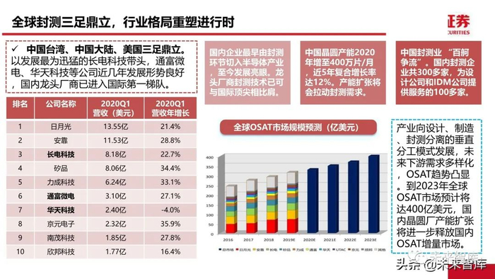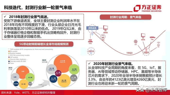 2020年封测行业景气来临。 从全球科技产业周期的角度来看,在 5G、IoT、服 务器、AI等领域带动存储器、HPC、基频等半导体 芯片的需求下,2020年全球半导体销售额预计增长3.3%,由去年的4123亿美元增至4260亿美元,封 测行业也将迎来新一轮的景气周期。