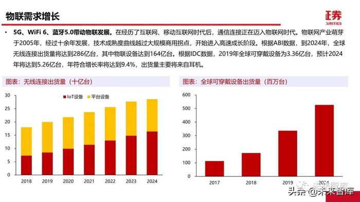5G、WiFi 6、蓝牙5.0带动物联发展。在经历了互联网、移动互联网时代后,通信连接正在迈入物联网时代。物联网产业萌芽 于2005年,经过十余年发展,技术成熟度曲线越过大规模商用拐点,开始进入高速成长阶段。根据ABI数据,到2024年,全球 无线连接出货量将达到286亿台,其中物联设备达到164亿台。根据IDC数据,2019年全球可穿戴设备为3.36亿台,预计2024 年将达到5.26亿台,年符合增长率将达到9.4%,出货量主要将来自耳机。