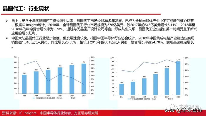自上世纪八十年代晶圆代工模式诞生以来,晶圆代工市场经过30多年发展,已成为全球半导体产业中不可或缺的核心环节 。根据IC Insights统计,2018年,全球晶圆代工行业市场规模为576亿美元,较2017年的548亿美元增长5.11%,2013年至 2018年的年均复合增长率为9.73%。通过与无晶圆厂设计公司等客户形成共生关系,晶圆代工企业能在第一时间受益于新兴 应用的增长红利。