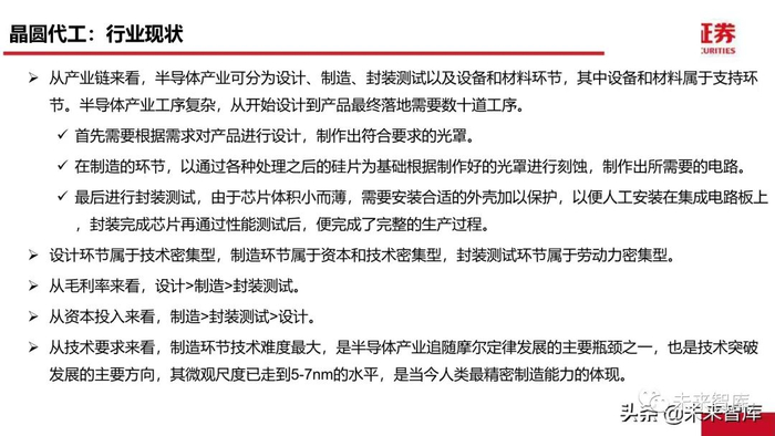 设计环节属于技术密集型,制造环节属于资本和技术密集型,封装测试环节属于劳动力密集型。