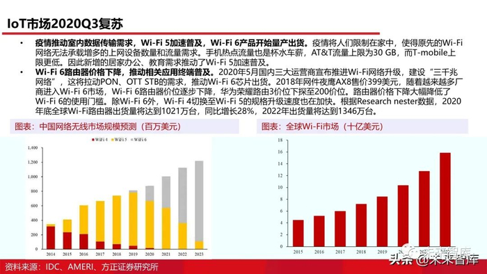 受疫情影响,换机周期推迟,预计明年5G手机出货5亿部。新冠疫情对手机市场造成了冲击,全球供应链出 现中断,封城、失业率降低了消费者换机欲望,另一方面,根据IDC数据,2020年全球智能手机出货量同比 下降12%左右,2021年增速将大幅提升,预计全年手机出货达到13.3亿部。根据Canalys等厂商数据,我们 预计2021年5G全球出货量将达到5亿台。