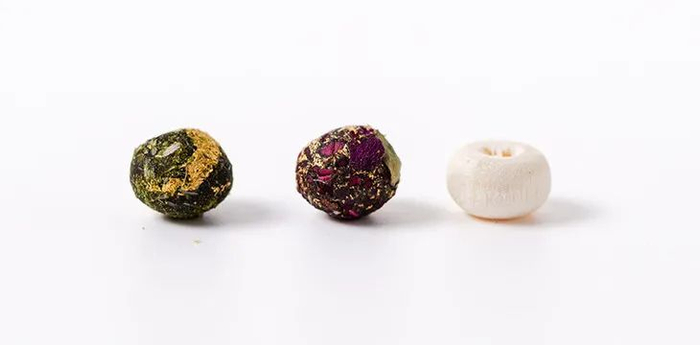 以宫廷古方和自然香材为基底,为香盈愿成·香囊红绳研发出两款手工金箔香丸——健康清秽香与贵妃帐中香。