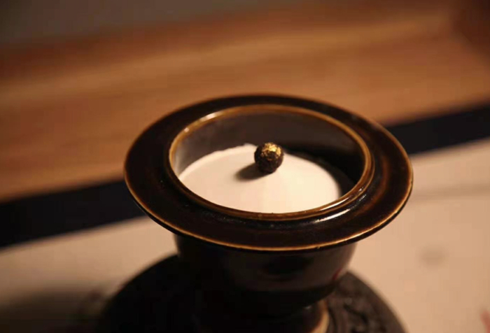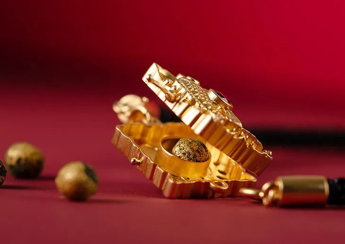 一颗裹着金箔和松针的健康清秽香香丸,安放圆形香盂中。走路、抬手摇晃也不会掉落。