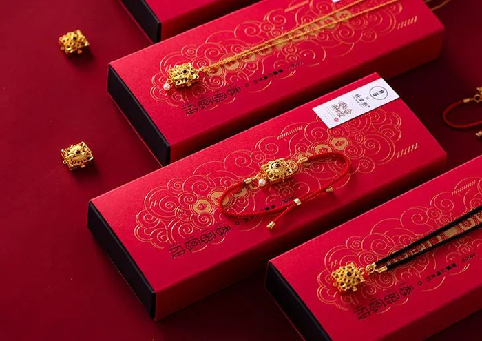 经过多种试样,我们选择给红绳的环坠设计成可拆卸,还根据男女性佩戴喜好不同,赠送不同的项链或颈绳一条。