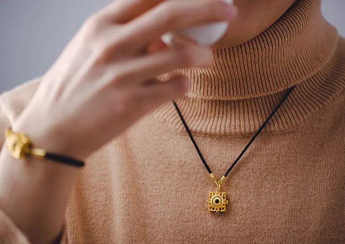 香囊可作为吊坠佩戴。女生戴银项链,香囊摇曳间,随佩戴之人步步生香,甚是优雅。男生则配黑色曼波颈绳,衬低调儒雅气质。