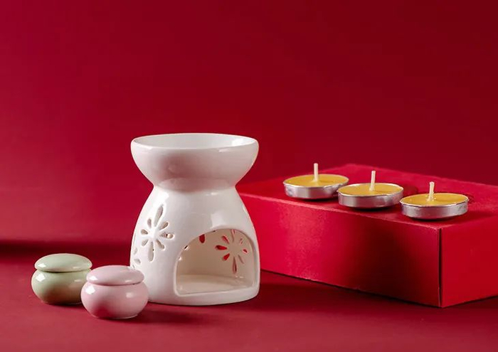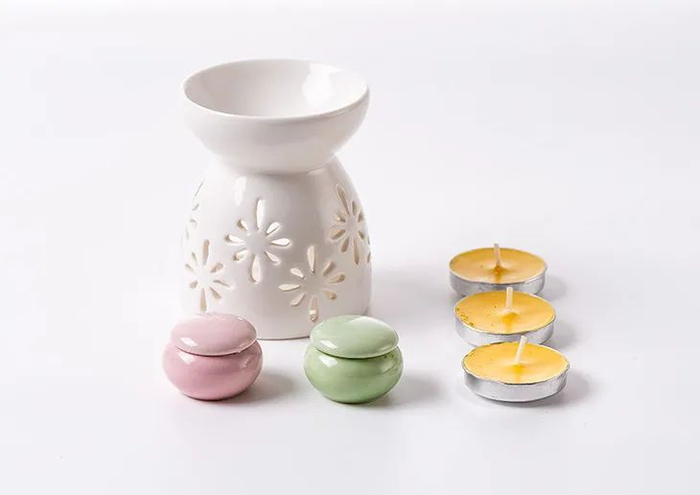 套装内含健康清秽香×1瓶(五颗)、贵妃帐中香×1瓶(五颗),赠:镂空陶瓷薰香炉×1个、酥油蜡烛×3。
