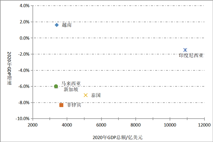 图3:2020年东南亚六国GDP增速及绝对数(预测)