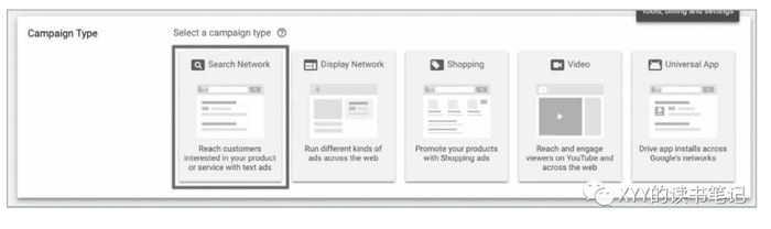 首先选择广告投放类型:在Adworks里面可以选择5种投放媒介类型,其中第一个是搜索平台,第二个是Google展示广告联盟,第三类是电商广告,第四类是视频广告,第五类是App类广告。对于初学者来说,首先选择搜索平台广告开始。